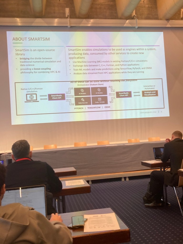The following talk was titled „Facilitating Synergies Between AI and HPC: Update on HPE SmartSim Strategy“ and given by Alessendro Rigazzi of HPE. Here is a photo that I made of one of the slides: