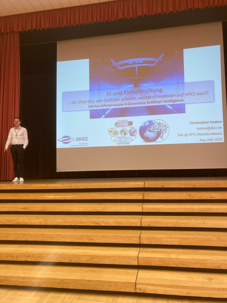 The first keynote titled „KI und Klimaforschung – der Chat-Bot, der Gedichte schreibt, wertet Klimadaten auf HPCs aus?!“ [AI and climate research – the chatbot, that is writing poems is analyzing climate data on high performance computers?!] was given by Dr. Christopher Kadow of DKRZ. This talk was full of facts and short project reports where HPC for climate research is enhanced by various AI methods, especially regarding data management and analysis. Tbh: this keynote overstrained me. 😉