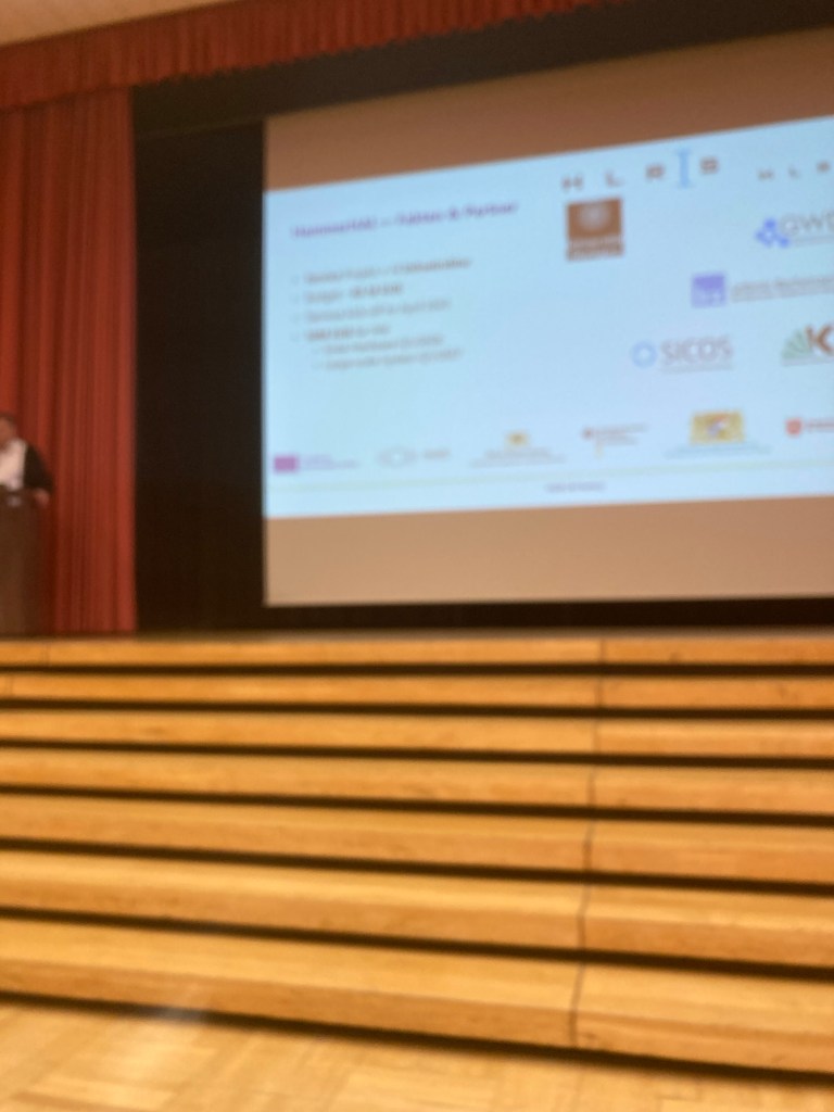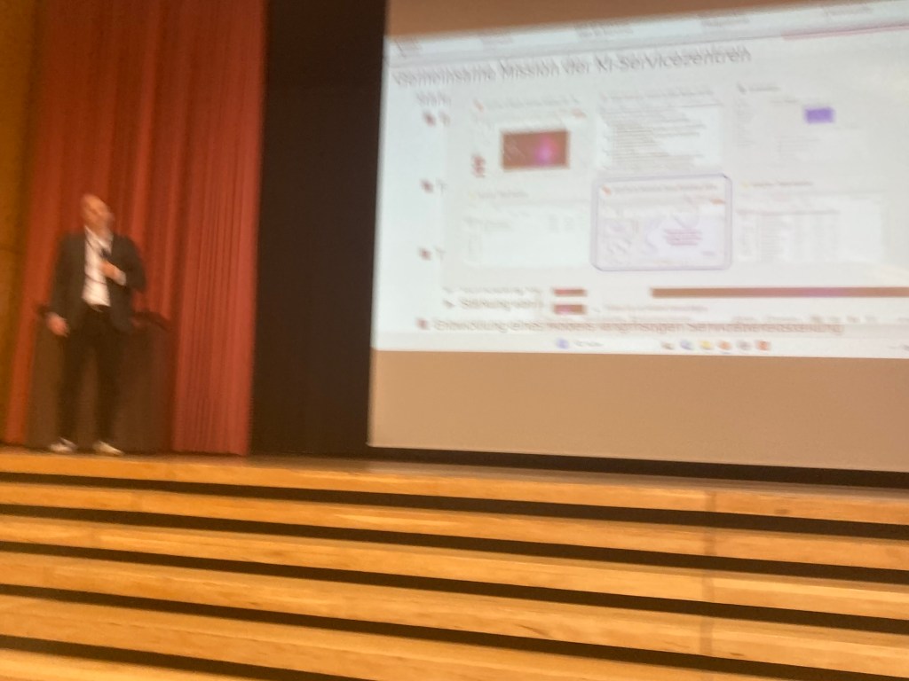 I skipped the early morning session of the third and final day (including the. keynote: „Towards in silico Neuroscience“ by Fabian Sinz, professor for macchine learning at the university of Goettingen, came late to the second: Christian Terboven of RWTH Aachen talked about the offerings of the German AI service centres – sorry for the fuzzy picture: