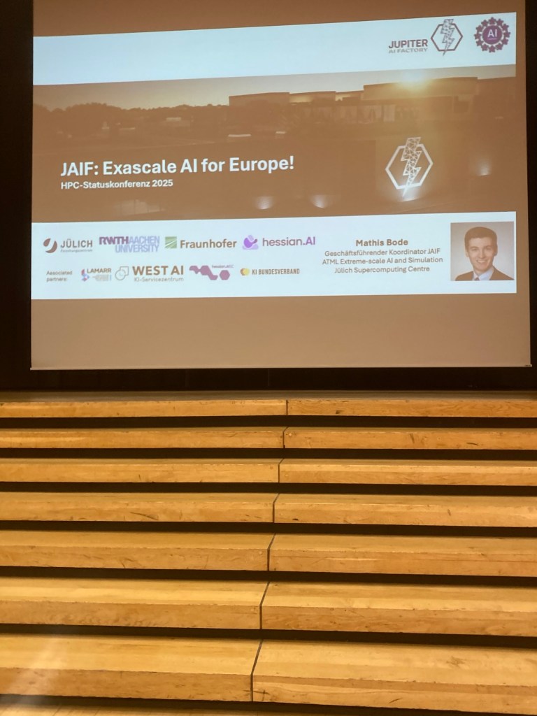 Mathis Bode presented „JAIF: Extreme-scale AI for Europe“: he started his talk with a short presentation on Jupiter, the first European exascale system installed at JSC@FZJ. JAIF is the second AI factory in Germany. Currently there is an call of the EU open for so-called Giga factories. Chancellor Merz said during the Jupiter inauguration ceremony: „Let‘s get at least one Giga factory to Germany!“ (see also the short video on UTube and the long video – caution: more than one hour and a half!)