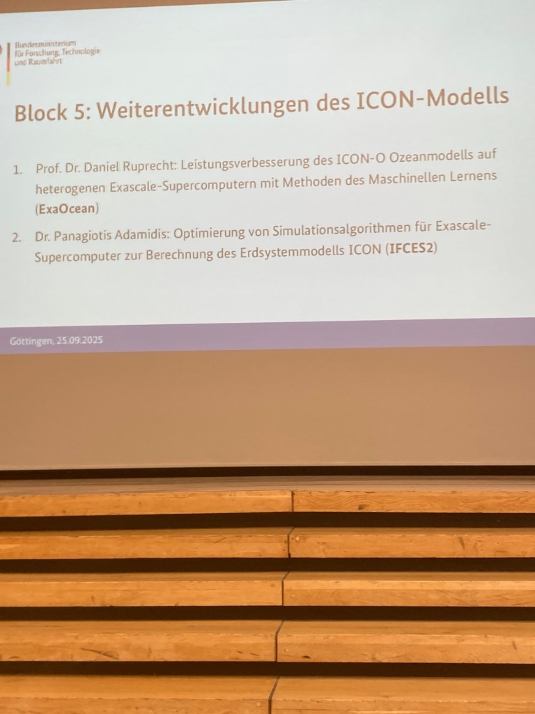 This was followed by a session on further developments of the ICON model: this is the current state-of-the-art for climate research as well as for weather forecast worldwide. Prof. Daniel Ruprecht from the technical university of Hamburg and Dr. Panagiotis Adamidis from DKRZ talked about their work on ICON (sorry I do not remember a lot from their talks).