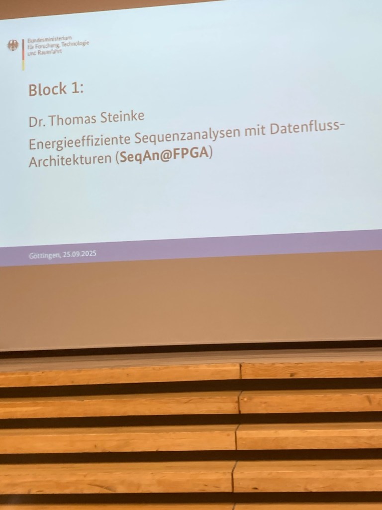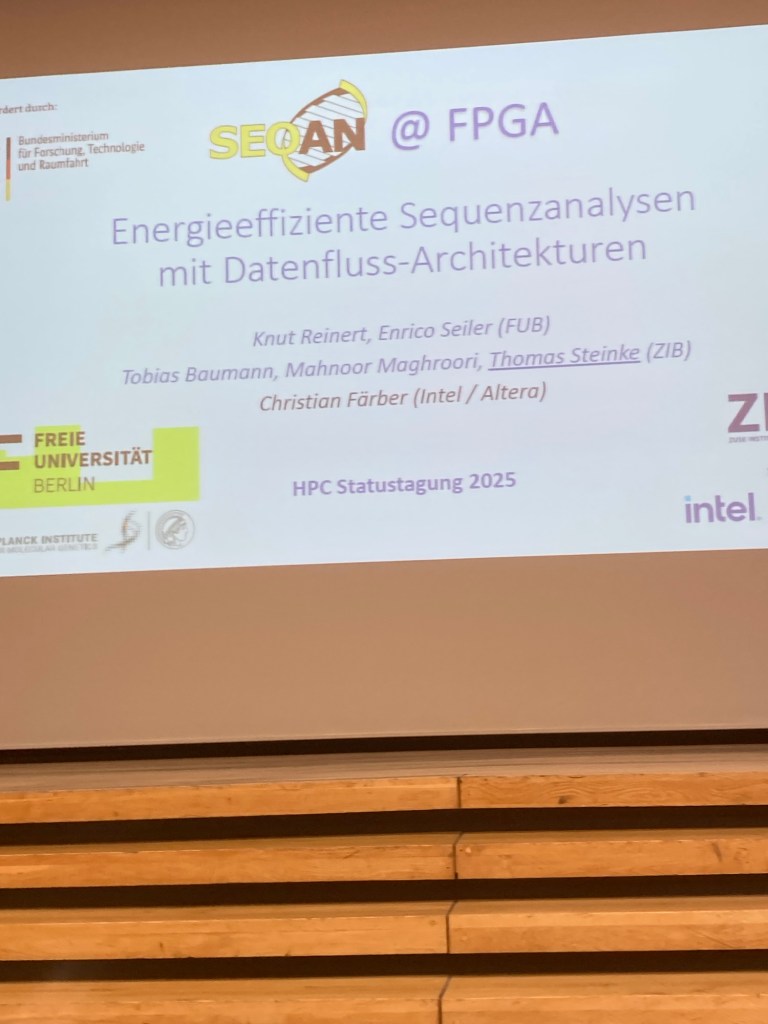 My friend Dr. Thomas Steinke (also from ZIB) gave a talk titled „SeqAn@FPGA: energy-efficient sequence analyses with data flow architectures“,