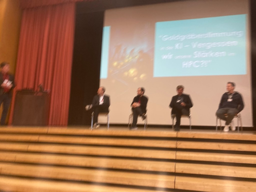 A common understanding of (almost) all particpants (not only of this panel but also other speakers) was that HPC and AI are not competing but complementing each other. A few years ago, people were talking about the convergence of HPC and AI. One speaker – I think it was Michael Resch – said that AI is just another although (very) important „method“ of HPC. A while ago, I said in an internal presentation at my former and last employer SICOS BW GmbH that HPC and AI is using more or less the same hardware. This is changing now, see what is said about Nvidia. Nevertheless: HPC and AI are not contradicting topics/subjects many HPC applications have been improved by AI.