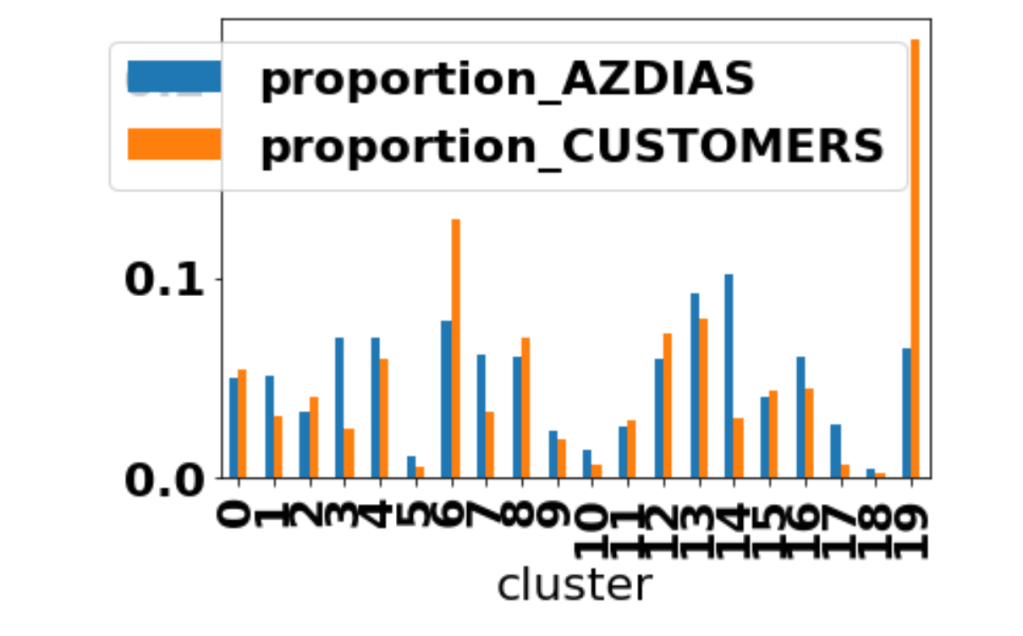In the diagram above, cluster 6 and 19 are groups of individuals that are over-represented in the customer database than in the general population: a marketing campaign aimed at expanding the company sales could target precisely those groups.